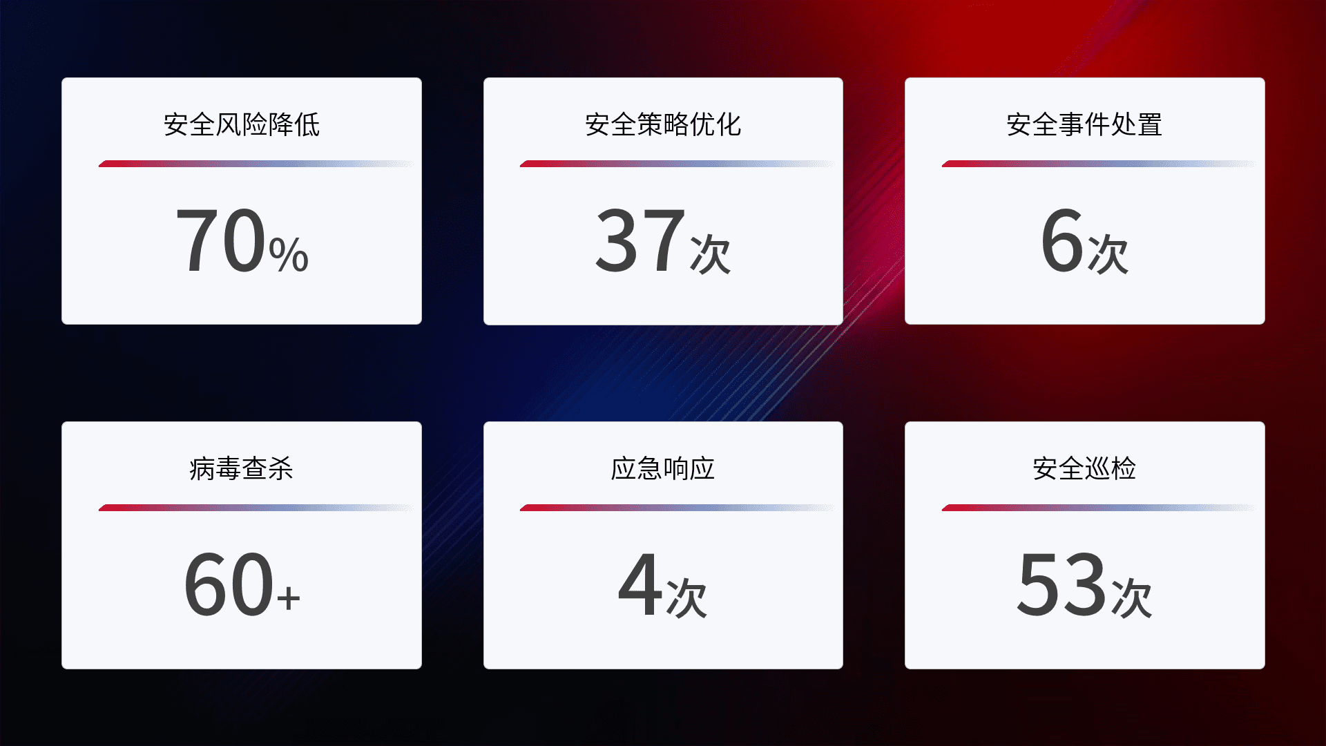 提供全面的安全事件报告体系,,包括处置报告、、、周报、、季度和年度总结,,,结合持续监控,,帮助客户深入了解网络安全状况。。