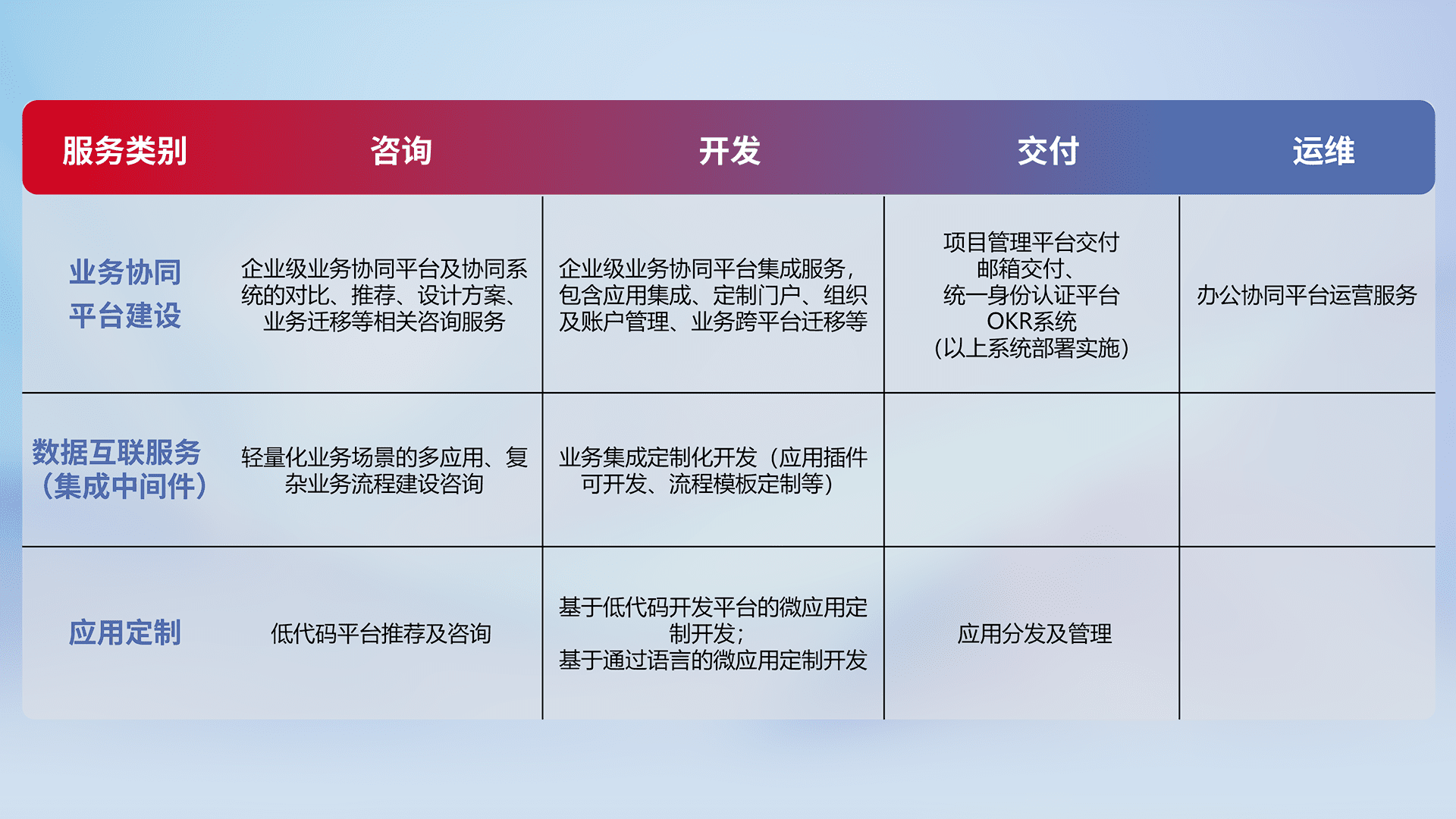 针对钉钉、、、企微、、IDaas等平台级产品提供产品的规划、、、、方案、、、交付、、定制化开发等服务,,,,实现如统一协同办公、、、、智能客户服务、、混合会议管理、、、、智能数据查询、、、、等业务场景,,,实现数字化转型。。。
